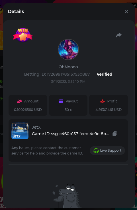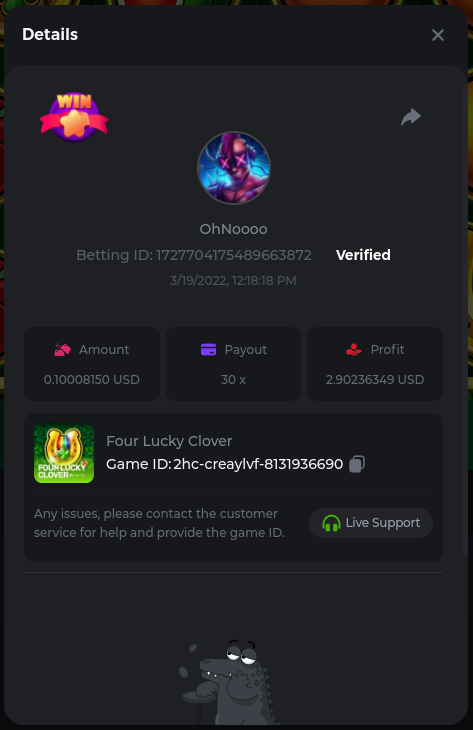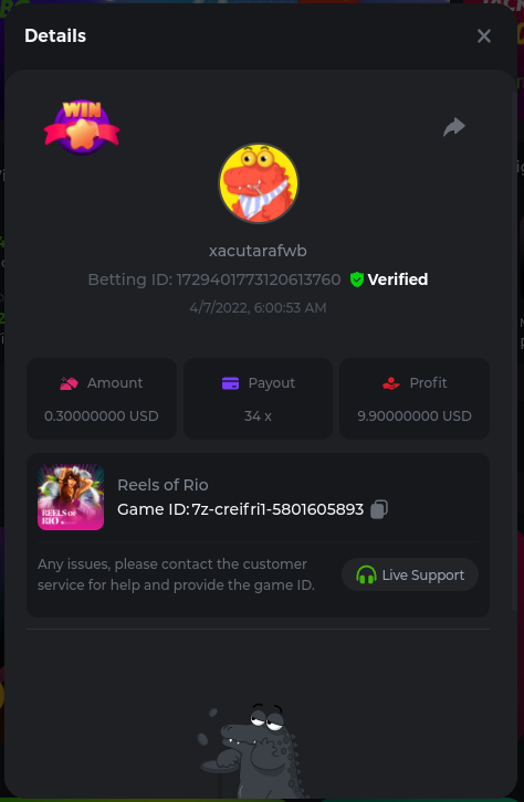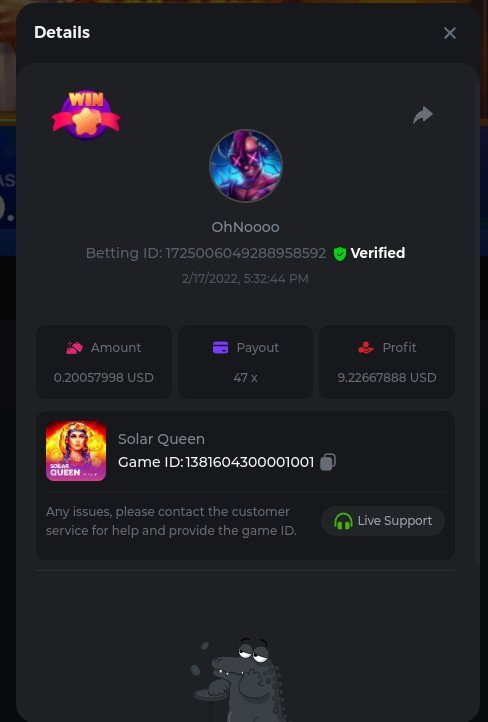 Golden Dancing Lion x 177.2 Betting ID: 1724947781266571904 Hit the Gold! x 44.8 Betting ID: 1724948222505448576 Tiger Jungle x 93 Betting ID: 1725143498319811079 Solar Queen x 47 Betting ID: 1725006049288958592