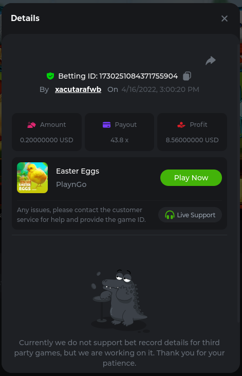 Easy Follow BCGame on Instagram (screenshot & IG username required). Post a photo or video on Instagram and tag BC.Game official profile (link to post & IG username required). Follow BCGame on Twitter (screenshot & twitter handle required). Like & Retweet the latest BC.Game Twitter post, tag at least 3 friends (link to post & twitter handle required). Follow BCGame on Facebook (screenshot & FB username required). Win a bet in Cave of Plunder on 7.50x payout (Completing all book symbols). https://bc.game/sd/?sd=10IK97QDGSLJPV Win a Sports bet with minimum odds being 1.3x (singles only) 1$ base min amount. Get a minimum 20x multi on Amatic Lady Fruits 100 Easter slot. Get a minimum 30x multi on Gamomat Ramses Book Easter Egg slot. https://bc.game/sd/?sd=10IKA3RC9WCTUB Enable 2FA for your BC.Game account (If it's already activated, keep it activated during event week). Medium Get a minimum 10x multi on Play&Go Easter Eggs slot . https://bc.game/sd/?sd=10IKAJU7TYZQC3 Win a bet in Roulette Single with betting on 0 only (36x). https://bc.game/sd/?sd=10IKAPIXLIF0GJ Get a 76x on Plinko. https://bc.game/sd/?sd=10IKB85MEHSSUR Get a minimum 60x multi on Wazdan Power of Gods™: Medusa Easter slot. https://bc.game/sd/?sd=10IKD69MDUBCIB Win a Sports bet with minimum odds of 2x (singles only) 1$ base min amount. Win a bet with Straight Flush in Video Poker (60x). https://bc.game/sd/?sd=10IKHG15WI1IQB Win a bet on Keno Single by selecting numbers 7, 30, and 8, Medium risk. (50x). https://bc.game/sd/?sd=10IKBI1TJRBWUR Get a minimum 90x multi on Big Time Gaming White Rabbit slot. https://bc.game/sd/?sd=10INY28VYQXUDV Win a bet by getting a natural Blackjack (A+K/Q/J/10) with only red cards in it. https://bc.game/sd/?sd=10IKCI4Q47Q0B7 Get a minimum 100x multi on No Limit City Bonus Bunnies slot. Hard Get a 49.50x on Wheel (50 segments, High risk). https://bc.game/sd/?sd=10IKIHFBAG6903 Get a 420x on Plinko (14 rows, High risk). https://bc.game/sd/?sd=10IO2W0TJPKWLV Win with a minimum 500x multi on Limbo. https://bc.game/sd/?sd=10IKH2KBUGNJF7 Get at least 300x multi on BGaming Hello Easter slot. Win with a minimum 999x on Crash. Get a minimum 100x multi on Pragmatic Chicken Drop slot. Get a minimum 100x multi on Push Gaming Fat Rabbit slot. Post a winning bet with 21 mines and 3 diamonds on Mines game, (569.25x). https://bc.game/sd/?sd=10IO1QLFAZMDQR Win a bet on Keno Single by selecting numbers 10, 11, 12 and 13, High risk, (259.00x). https://bc.game/sd/?sd=10INWO7SK5TN2R Win a Sports bet with minimum odds of 10x (any bet allowed) 1$ base min amount.
