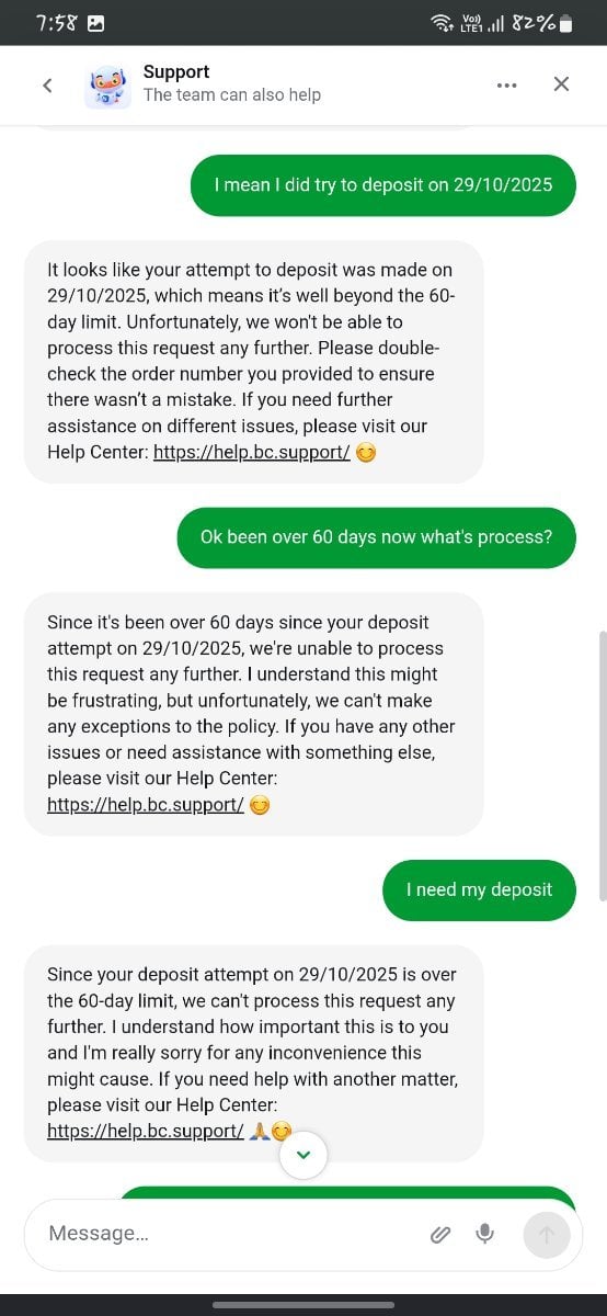 LeEappu Posted December 31, 2025 Share Posted December 31, 2025 (edited) BC GAME DEPOSIT FRAUD I have been facing a serious issue with a deposit that was successfully paid from my side but has not been credited to my BC.Game account. I have provided every proof possible, yet I have received no resolution or meaningful support. Deposit Issue Details BC Game ID: 5160414 Amount: 15000 INR UTR: 391557750002 Order ID: F-1847495123321369581 TxID: 59968 Date & Time: 31/10/2025, 4:34:08 pm Status Shown on BC.Game: Canceled Credited Amount: 0 INR What Actually Happened I paid 15000 INR successfully through UPI. The amount was debited from my bank account. I have attached: Bank statement Payment confirmation screenshots Video proof of the transaction After creating a support ticket, it was canceled automatically, with no help provided. I contacted the merchant, and they confirmed they received the payment, but said I must contact BC.Game support for the credit. Unfortunately, BC.Game support: Provides only automated bot replies Does not offer any human assistance Does not respond to emails at [email protected] Leaves tickets pending for long periods with no action Why I Am Posting Here I have exhausted all official support channels: Live chat only replies with repetitive bot responses Email support has not responded for a long time Discord moderators simply redirect users back to the live chat bot In this case, the system clearly shows a deposit failure, but the amount was successfully received by the merchant, and all proof from my side is genuine and already submitted. I am requesting a manual review of this transaction, as this is serious and concerns real money lost due to system failure. Request Please review my transaction manually and credit the deposit amount to my account, or process a refund if crediting is not possible. All data, screenshots, and video proof can be re-submitted if needed. I hope this issue can be resolved professionally and promptly. Thank you. Edited December 31, 2025 by LeEappu Link to comment Share on other sites More sharing options...